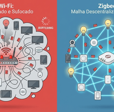 "Cansado de ver seus dispositivos inteligentes 'offline'? O problema pode não ser a marca da lâmpada, mas o seu roteador. Entenda a diferença técnica entre Wi-Fi e Zigbee e saiba por que os profissionais preferem redes em malha para evitar lentidão."