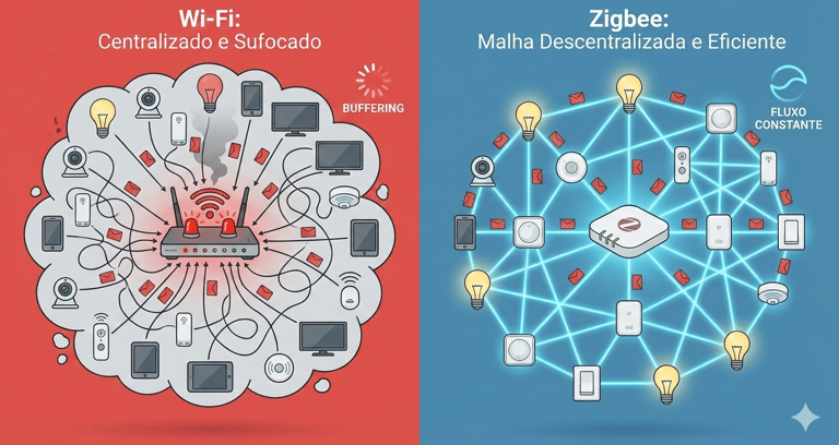 Um gráfico comparativo mostrando um roteador Wi-Fi "sufocado" por ícones de dispositivos vs. uma rede Zigbee organizada em malha